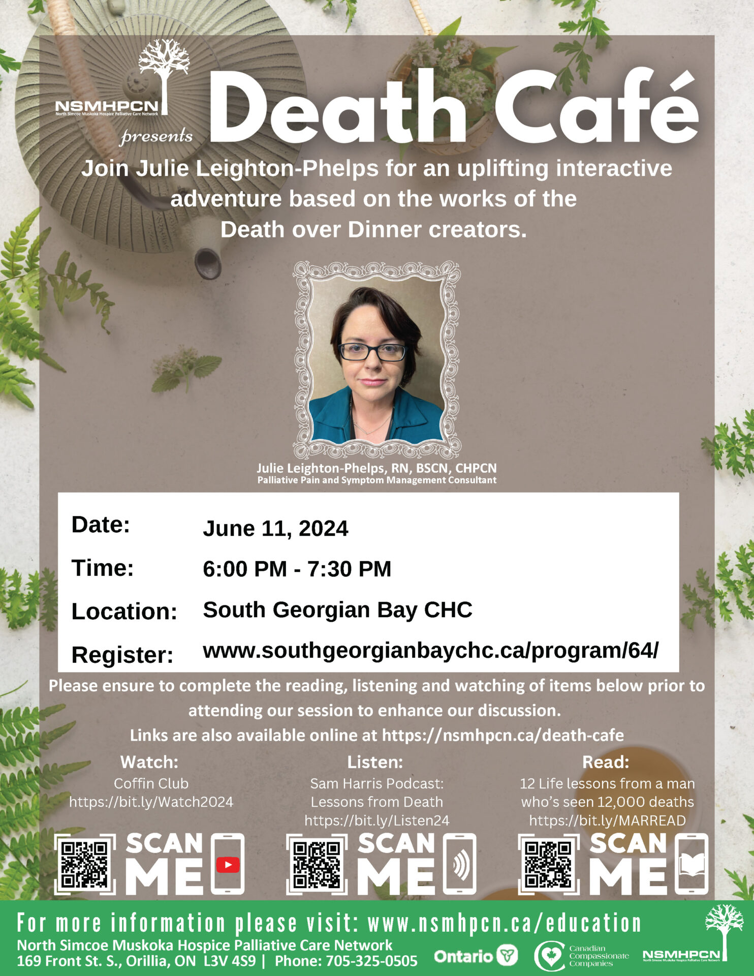 This workshop offers a unique gathering, where individuals come together to share cake, sip tea and engage in conversations about death. Unlike grief support or counselling sessions, Death Cafe is a discussion group with no set agenda or themes. Hosted by the SGBCHC, these sessions are led by a Pain and Palliative Symptom Management Nurse Consultant along with a representative from the SGBCHC.